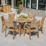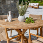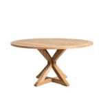 The Aurelia 5 ft. round teak dining table features wide timbers and X-shaped legs. Perfect for modern or traditional settings, it seats 6 to 8 with ample knee room and water-draining slats.