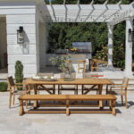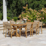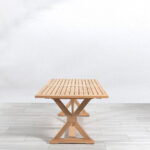 The Aurelia 8 ft. farmhouse teak extension table provides ample seating for 8 to 12 people. Crafted from Grade A teak with X-shaped legs, perfect for modern farmhouse and traditional aesthetics.