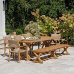 The Aurelia 8 ft. farmhouse teak extension table features X-shaped legs and expandable leaves (sold separately) to comfortably seat 8-12 people, making it ideal for both casual and formal gatherings.