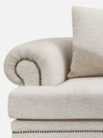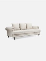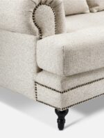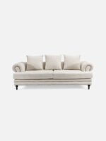 The Camden Sofa by Luxury Furns blends timeless elegance with everyday comfort. Crafted from premium teak wood, this three-seater sofa features a classic profile with rolled arms, brass nailhead detailing, and expertly turned wooden legs. Upholstered in a soft ecru fabric and finished in a sophisticated black matte, Camden is designed to bring old-world charm into modern homes.