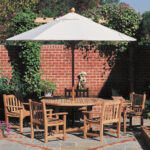 The Halden round teak dining table offers generous seating for up to eight, with a refined pedestal base and timeless design. Crafted from Grade A teak and includes an umbrella hole for shaded comfort.
