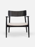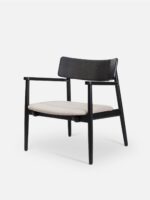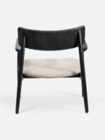 A standout detail is the black-dyed rope accent woven partially across the backrest, adding modern texture and depth to the chair’s clean silhouette. The teak wood frame, finished in a rich matte black, is perfectly contrasted by a soft beige upholstered seat, creating a neutral yet luxurious palette that complements any décor style—from minimalist to bohemian to contemporary luxe.