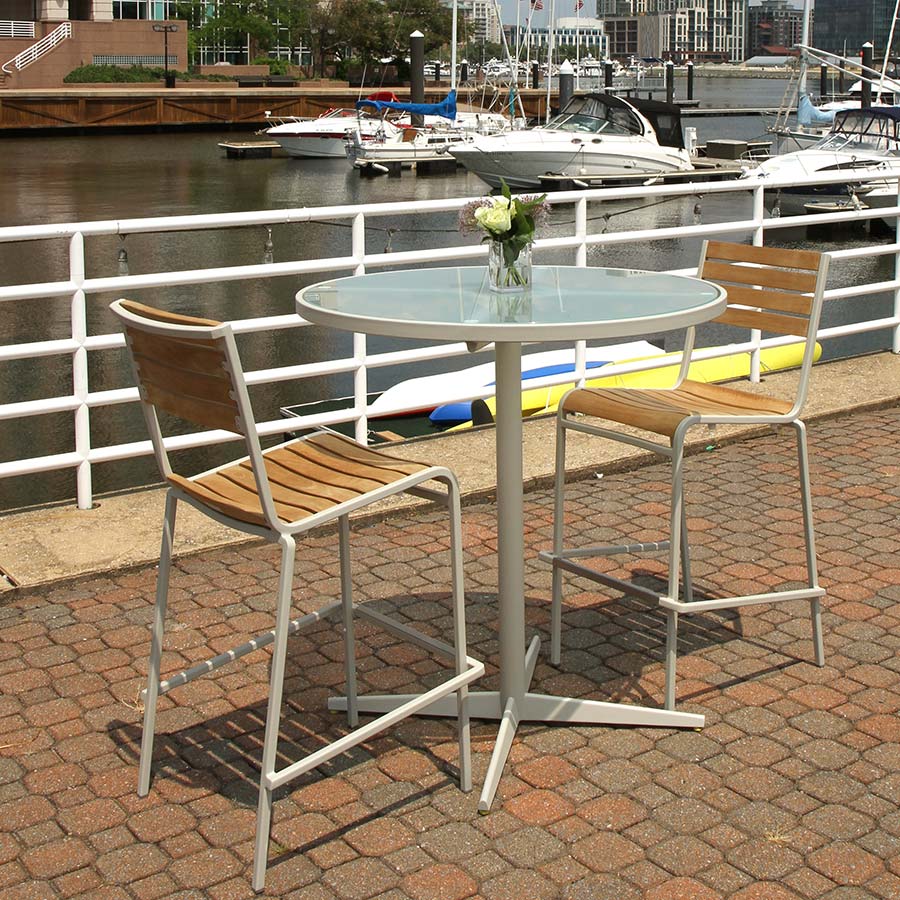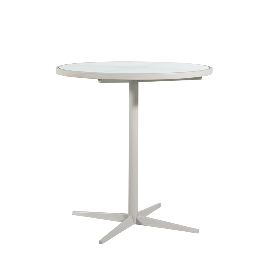 The Vireo round bar table features an easy-to-clean tempered glass top and powder-coated steel frame?built for durability and ideal for both commercial patios and upscale outdoor lounges.