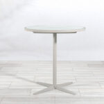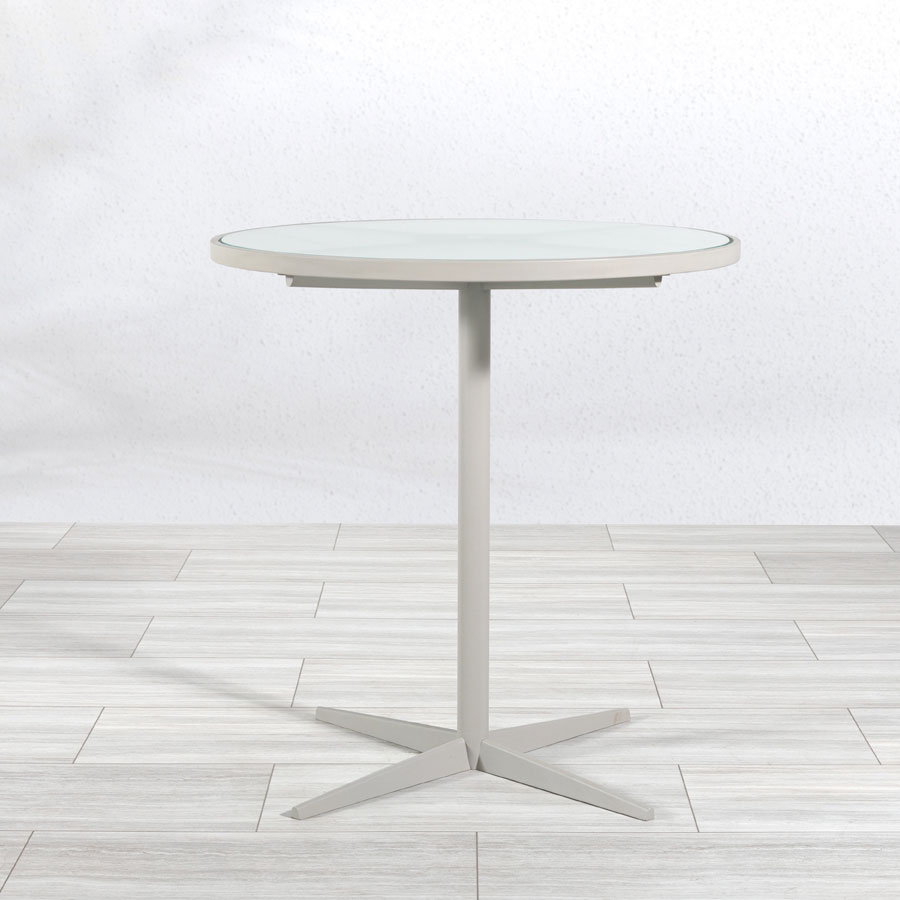 The Vireo 40 in. round glass bar table offers sleek, modern style with commercial-grade durability. Sandblasted tempered glass and a powder-coated steel frame make it ideal for outdoor dining or drinks.