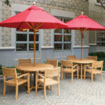 The Wexley round teak dining table features a pedestal base for added comfort, a timeless design, and an umbrella-ready slatted top. Seats up to six and is crafted from premium Grade A teak for long-lasting outdoor elegance.